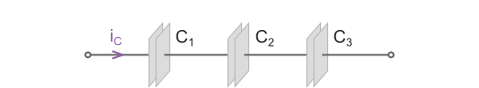 Последовательное соединение конденсаторов Ток (iC), заряжающий последовательную цепь конденсаторов, будет одинаковым для всех конденсаторов, поскольку у него есть только один возможный путь прохождения:
