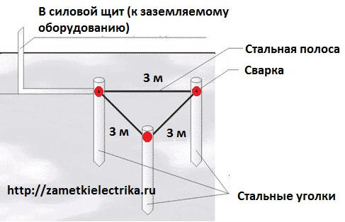 Траншея для контура заземления В вершины данного треугольника забиваем кувалдой стальной уголок (вертикальные заземлители) длиной 2,5-3 метра. Вместо кувалды можно использовать специальные буры. Если траншея у Вас выкопана в виде прямой линии, то забиваем вертикальные электроды в количестве 4-5 штук через каждый метр. Чтобы легче забивать стальные уголки в землю, заострите их концы болгаркой. Забиваем стальные уголки (вертикальные электроды) не полностью, а оставляем около 20 (см). Затем с помощью сварочного аппарата привариваем к нашим стальным уголкам по периметру треугольника или прямой линии горизонтальную стальную полосу, идущую в силовой электрический щиток на шину РЕ (ГЗШ). Проводник, который соединяет заземляющее устройство с заземляющей частью электроустановки (вводным распределительным устройством или сборкой), называется заземляющим. В нашем примере в качестве заземляющего проводника применяется стальная полоса размерами 40 х 4 (мм), что удовлетворяет требованиям ПУЭ. В итоге у нас получается вот такая конструкция (схема). Кстати забыл сказать, что места сварки нужно обработать антикоррозийным составом, например, битумом, а траншею закопать однородным грунтом.