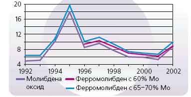 Рис.38. Динамика среднегодовых цен на продукты молибдена на западноевропейском рынке, дол/кг Мо в продукте (по данным ИАЦ "Минерал" с использованием материалов Metal Bulletin) По добыче молибдена в рудах и производству молибденового концентрата Россия занимает 5-е место в мире, уступая США, КНР, Чили и Канаде. Практически весь концентрат производится АО "Молибден" из руд Сорского месторождения в Хакассии. Начиная с 1993 г. темпы падения внутреннего потребления молибдена намного опередили темпы сокращения производства. Это позволило увеличить поставки российского молибденового концентрата на мировой рынок. В 1991 г. для удовлетворения внутренних нужд было импортировано 7,7 тыс. т концентрата, а в 2001 г. Россией было поставлено на внешний рынок 9,4 тыс. т (в 1999 г. -10,9 тыс. т). Российские молибденовые концентраты характеризуются высоким качеством. Они экспортируются в Нидерланды, Бельгию, Узбекистан, Киргизию и Украину. В последние годы концентрат стал поставляться в Китай. Несмотря на относительно невысокие цены последних лет на молибден (рис. 38), этот металл считается перспективным для производства. Растущий спрос на молибден обеспечивают производители нержавеющих сталей и автомобильных катализаторов. Считается, что в ближайшей перспективе годовой прирост будет составлять 2-3 %.