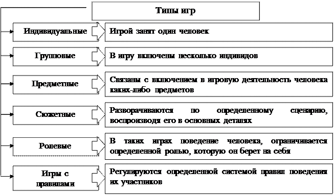 Виды человеческой деятельности, их классификация Возникновение и развитие различных видов деятельности человека–сложный и длительный процесс. Выделяют три генетически сменяющих друг друга и сосуществующих на протяжении всего жизненного пути человека вида деятельности: игру, учение, труд. Они различаются по конечным результатам (продукту деятельности), организации и особенностям мотивации. Игра – форма человеческой деятельности в условных ситуациях, направленная на воссоздание и усвоение общественного опыта, фиксированного в социально закрепленных способах осуществления предметных действий. Выделяют несколько типов игр.