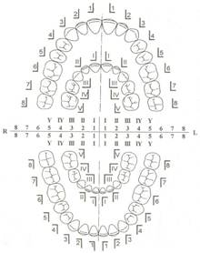 1. Ротовая полость. Ротовая полость отграничена сверху твердым и мягким небом, сбоку — мышцами щек, снизу — челюстноподъязычной мышцей. Молочные зубы к 12 годам заменяются постоянными. У взрослого человека в ротовой полости 32 зуба: в каждой челюсти 4 резца, 2 клыка, 4 малых коренных и 6 больших коренных зуба. Количество зубов можно изобразить в виде зубной формулы: Зуб состоит из трех частей: коронки, выступающей в ротовую полость, корня, прикрытой десной, и шейки, находящегося в зубной альвеоле. Зубы состоят из разновидности костной ткани — дентина, снаружи покрыты эмалью, внутри зуба имеется полость, в которой расположена пульпа — рыхлая соединительная ткань, содержащая кровеносные сосуды и нервы. Цемент и связки закрепляют зубы в альвеолах.