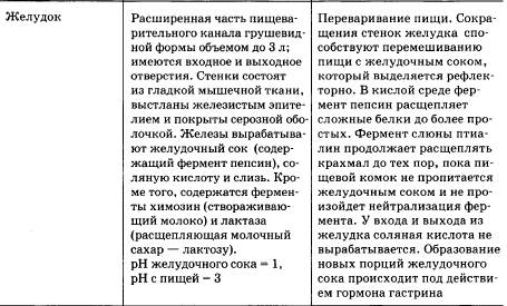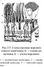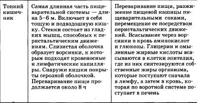 4. Кишечник. Из двенадцатиперстной кишки пищевая кашица попадает в тощую, а затем подвздошную кишку. Петли этих отделов тонкого кишечника подвешены брыжейкой к задней стенке брюшной полости, спереди прикрыты сальником. Ферменты кишечника: амилаза, мальтаза, лактаза, сахараза расщепляют углеводы; эрепсин — пептиды и дипептиды, липазы — жиры. Происходит полостное и мембранное пищеварение. Благодаря тому, что слизистая кишечника имеет многочисленные складки, ворсинки и микроворсинки на клетках ворсинок, поверхность мембранного пищеварения и всасывания очень велика. В ворсинку входят нервы, капилляры и лимфатические сосуды. Аминокислоты и глюкоза всасываются в капилляры кровеносной системы, глицерин и жирные кислоты — в эпителий ворсинок, где синтезируются жиры, поступающие затем в лимфатические капилляры