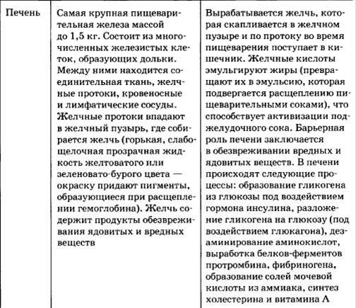 Печень. Самая крупная железа человека, расположена в брюшной полости, справа, под диафрагмой. Масса печени составляет в среднем 1,5 кг. В ворота печени входят воротная вена печени, печеночная артерия, выходят печеночная вена и печеночный проток. В печени различают две доли, большую — правую и меньшую — левую. Клетки печени (гепатоциты), собраны в дольки, которые являются структурной и функциональной единицей печени. Таких долек насчитывается около 500000. Образование желчи происходит непрерывно, и она накапливается в жилочном пузыре. Функции. Желчь не содержит ферментов, она усиливает работу поджелудочной железы, активизирует ее ферменты, эмульгирует жиры (увеличивая их поверхность в 40000 раз). Барьерная: вредные и ядовитые вещества, всосавшиеся в кровь из кишечника, попадают через воротную вену в печень и обезвреживаются. Запасающая: в печени запасаются избыток глюкозы в форме гликогена, витамины, железо, высвобождающееся при разрушении гемоглобина. Печень участвует в углеводном обмене участвуя в регуляции содержания сахара в крови, в белковом обмене, превращая аммиак в мочевину. Желчь выводит в просвет кишечника продукты распада гемоглобина. В печени синтезируются белки плазмы крови, в частности протромбин, участвующий в свертывании крови.