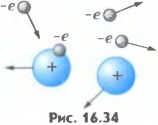 то при столкновении электрона с атомом происходит ионизация (рис.16.34). В результате вместо одного свободного электрона образуются два (налетающий на атом и вырванный из атома). Эти электроны, в свою очередь, получают энергию в поле и ионизуют встречные атомы и т. д. Число заряженных частиц резко возрастает, возникает электронная лавина. Описанный процесс называют ионизацией электронным ударом. Но одна ионизация электронным ударом не может обеспечить длительный самостоятельный разряд. Действительно, ведь все возникающие таким образом электроны движутся по направлению к аноду и по достижении анода «выбывают из игры». Для существования разряда необходима эмиссия электронов с катода (эмиссия означает «испускание»). Эмиссия электронов может быть обусловлена несколькими причинами. Положительные ионы, образовавшиеся при столкновении свободных электронов с нейтральными атомами, при своем движении к катоду приобретают под действием поля большую кинетическую энергию. При ударах таких быстрых ионов о катод с поверхности последнего выбиваются электроны.