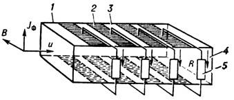 Рис. 1. Схема линейного фарадеевского секционированного МГД-генератора: 1 - канал; 2 - электроды; 3 - межэлектродные изоляторы; 4 - боковые изоляционные стенки; 5 - сопротивления нагрузки; стрелками указано направление тока в нагрузке. Устройство и принцип действия. М. г. состоит (рис. 1-3) из канала, в к-ром формируется поток, индуктора, создающего стационарное или переменное (бегущее) магн. поле, системы съёма энергии с помощью электродов (кондукционные М. г.) или индуктивной связи потока с цепью нагрузки (индук-