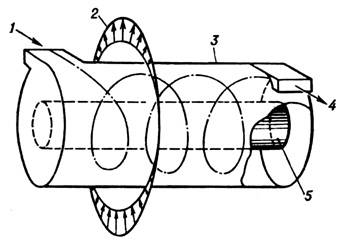 Рис. 3. Схема коаксиального индукционного МГД-генератора: 1 - подвод рабочего тела; 2 - мгновенная эпюра бегущего магнитного поля; 3 - наружный корпус канала МГД-генератора, на котором размещается волновая обмотка индуктора (статор); 4 - выхлоп; 5 - стенка и внутренний магнитопровод МГД-генератора.