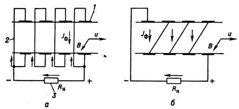 Рис. 4. Электрические схемы линейных МГД-генераторов: холловского (а) и диагонального (б) типов: 1 - электроды; 2 - канал; 3 - нагрузка.