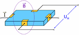 В магнитном поле с индукцией В находится полупроводниковая пластинка, например, из арсенида иридия или антимонида индия, через которую протекает электрический ток I. Действие эффекта Холла заключается в том, что на боковых сторонах пластинки перпендикулярно направлению тока возникает разность потенциалов - напряжение Холла или ЭДС Холла UH. Максимальное значение UH принимает при совпадении вектора В с нормалью к пластинке. Применение эффекта Использующие эффект Холла датчики Холла применяются в генераторах Холла (рис. 4) и датчиках тока.