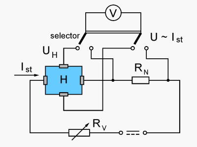 Его принцип действия основан на измерении ЭДС Холла UH, пропорциональной магнитной индукции поля, при постоянном управляющем токе Ist. При помощи добавочного сопротивления RV устанавливается оптимальное значение управляющего тока, которое контролируется вольтметром через падение напряжения на резисторе RN. Этот же вольтметр переключается для измерения ЭДС Холла. При наличии двух прямоугольных расположенных напротив друг друга датчиков Холла можно определить направление магнитного поля.