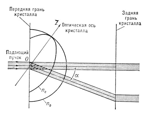 Tg i=n Двойное лучепреломление, расщепление пучка света в анизотропной среде (например, в кристалле) на два слагающих, распространяющихся с разными скоростями и поляризованных в двух взаимно перпендикулярных плоскостях. Двойное лучепреломление впервые обнаружено и описано профессором Копенгагенского университета Э. Бартолином в 1669 в кристалле исландского шпата. Если световой пучок падает перпендикулярно к поверхности кристалла, то он распадается на 2 пучка, один из которых продолжает путь без преломления, как и в изотропной среде, другой же отклоняется в сторону, нарушая обычный закон преломления света (рис.). Соответственно этому лучи первого пучка называются обыкновенными, второго — необыкновенными.