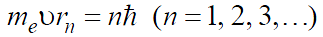 (I) Первый постулат Бора (постулат стационарных состояний): существуют стационарные (не изменяющиеся со временем) состояния атома, находясь е которых он не излучает энергии. Стационарным состояниям атома соответствуют стационарные орбиты, по которым движутся электроны. Каждое стационарное состояние характеризуется определенным (дискретным) значением энергии. Движение электронов по стационарным орбитам не сопровождается излучением электромагнитных волн. Правило квантования орбит Бора утверждает, что в стационарном состоянии атома электрон, двигаясь по круговой орбите, должен иметь квантованные значения момента импульса, удовлетворяющие условию где те - масса электрона, и - его скорость на п-м орбите радиуса rn,