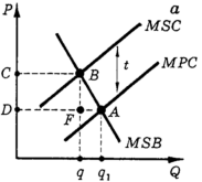 Без корректирующего налога рыночное равновесие было в точке А. Введение налога привело (в условиях совершенной конкуренции) к росту цены и подняло МРС до уровня MSC. Это привело к уменьшению выпуска продукции. Величина налогового сбора равна площади прямоугольника CBFD. Новое равновесие, достигнутое в точке В, является эффективным, так как выполняется условие: МРС + МЕС = MSC = MSB. Уменьшение общественных затрат, а следовательно и выигрыш в эффективности, равно площади треугольника BAF. Целью корректирующей субсидии является выравнивание предельной частной и предельной общественной полезности. До введения субсидии рыночное равновесие было в точке A. Пусть предельные внешние выгоды постоянны и введена корректирующая субсидия s = MEB. Это приведет к увеличению спроса на благо, что в свою очередь вызовет рост объема производства и цены. Новое равновесие соответствует точке B, и количество производимого блага будет эффективным, поскольку выполнено условие: MEB + MPB = MSB = MSC, где MPB - предельные частные выгоды. Общая величина субсидии равна площади прямоугольника CDFB. Однако использование корректирующих налогов и субсидий наталкивается на некоторые препятствия. Сопоставим действие налогов и штрафов. 1. Введение потоварного налога приводит к желаемому результату лишь в предположении, что существует единственно возможная технология производства продукта, так что объем выпуска и размер внешнего эффекта однозначно связаны друг с другом. Если же при одном и том же объеме выпуска величина внешнего эффекта может варьировать (скажем, фирма может строить или не строить очистные сооружения), то налог на продукт не побуждает фирму выбирать технологию, эффективную с общественной точки зрения.