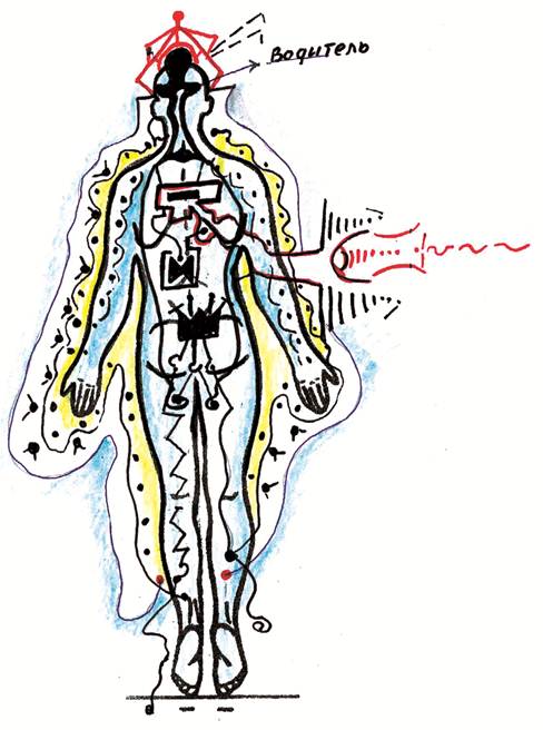 Дальнейший материал по этой тематике не подлежит разглашению в виду необычности и сложности данного материала. Я неоднократно пытался выйти на контакт с человеком-Чёрным. Черные предпочитают находиться в местах большого скопления людей, чтобы оставаться незамеченными в толпе. Чаще всего Черного можно встретить в метрополитене. Я сканирую пассажиров электричек с целью обнаружения Чёрного. На состав обычно приходится один-два таких человека. Вычисленный Чёрный, обладая высокой экстрасенсорной чувствительностью, сразу чувствует, что его обнаружили, и старается скрыться, избегая контакта с его обнаружившим. Они не изучены. Возможности и особенности Чёрных пока неизвестны. Контакт с ними потенциально опасен. Чёрные идут на контакт с обычными людьми, которые не могут почувствовать их особенность и не обладают экстрасенсорной чувствительностью. Человеком без экстрасенсорных способностей, Чёрный воспринимается как обычный человек, такой же, как он сам. Чёрный является биороботом. Биополе человека отсутствует полностью. На рисунке 22. внутри фантома показана энергомеханическая схема с «водителем» внутри головы. Здесь также показана высокая энергетическая защищенность тела носителя до уровня ушей. Голова управляющей сущности («водителя») защищена системой сложной конфигурации. Работа системы внутри груди осуществляется в дециметровом диапазоне. Строение внутренней схемы показывает, что это биоробот с высокоорганизованной программой действий. Цель: познание Земного мира и его обитателей – людей. Бывают двух видов. Первый вид – чистый биоробот. Второй вид – ГТП, внедренный в человека. Их действия несанкционированны Советом Адептов Кольца Рады Земли.