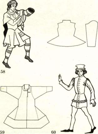 н а оде ж д ы прилега ющ ег о силуэт а н е заходил а з а лини ю бедер. И стори к кост юм а М. Н. М ер - цалов а та к характеризуе т м у ж ско й кост ю м это г о периода: «П ропорци и ново г о м у ж ског о кост юм а в сочетани и с остроносо й обувь ю ,, рои 1 ате " и в ы соки м голов ны м уборо м слегк а конусообразно й ф орм ы... ка к б ы в ы тягивал и фи гуру, он а казалас ь н е тольк о боле е в ы сокой, н о и подчеркнут о гибко й и ловкой»*. Д л я оде ж д ы прилега ющ ег о силуэт а характере н пурпуан — коротка я обтя жн а я куртк а с засте ж кой- ш нуровко й сперед и ил и сзади, безрукавна я ил и с длинн ы м рукавом. К пурпуан у об ы чн о крепилис ь ш та ны -чулки; впоследстви и у з на т и о н превра щ аетс я в нижн ю ю оде ж ду. Д етал и кро я пурпуан а повторял и ф орм у р ыц арски х ла т X I V — X V вв. (рис. 59). П овер х пурпуан а надевал и узко е коротко е котарди с засте ж ко й сперед и н а пуговиц ы и декоративн ы м поясо м п о бедра м (рис. 60). В X I V в. ег о за м еняе т
