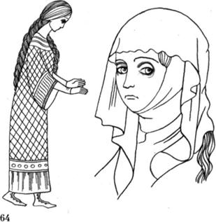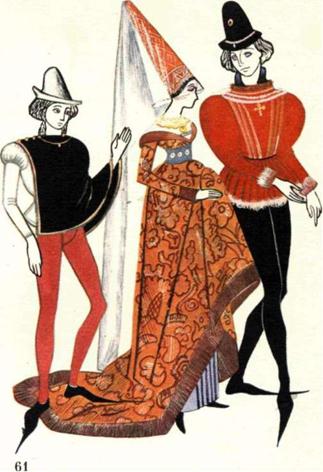 ным и п о окат у бу ф а м и (рис. 61). В конц е период а в кост юм е таког о тип а исполь зовалис ь ватн ы е прокладк и (в област и груд и и валик и н а плечах) — дл я хоро ш е й посадк и и подчеркивани я м у ж ественност и облика. О блега ющ и е коротки е куртк и носил и с шосса- м и — ш та нами -чулка м и и з эластичног о сукна, туг о облега ющ им и но ги, и с остроносо й обувь ю пигаш, носочна я част ь которо й с X I V в. ста нови тс я утрированн о длинно й (д о 7 0 с м) в зависи мо ст и о т об щ ественног о положени я е е владельца. Ц ве т обув и т щ ательн о подбирал и к нарядно й оде ж де: бел ый, пурпурный, и з золоче но й ко ж и с драгоценностя ми. П о ф орм е обув ь б ы л а одинаково й дл я право й и лево й но ги. У зки й кост юм, подчеркива ющ и й строй нос ть, в ы тя ну тост ь фи гур ы, дополнялс я верх не й оде ж до й — длинно й ил и короткой, очен ь ш ироко й вниз у и п о ни з у рукавов, ниспада ю щ е й ровн ым и ф алда ми. В контраст е дву х раз ны х силуэто в эстетически е качеств а м у ж ско й фи гур ы б ы л и е щ е боле е в ы разительн ы. П рямо й свободн ы й силуэ т имел о сюрко — длин
