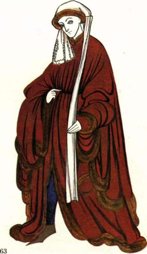 (о т ф ранц. s u rc o t) — надеваема я повер х кот т оде ж да. Д екоративн о в не й подчеркивалис ь лини и горлови ны, пройм ы и ни за. В конц е X I V — X V вв. с ю рк о в ы тес няе тс я у п е л я н д о м (рис. 63) — верхне й накладно й и распа ш но й оде ж до й разно й длин ы, котору ю носил и с поясо м и бе з не го. Н аиболе е характер ным и эле м ента м и это й оде ж д ы б ы л и нес ш иты е бока, засте ж к а сперед и н а нескольк о пугови ц н а стояче м, отделанно м м ехо м воротнике, от делк а мно гочисле нным и зубчат ым и ф естона ми. Д линн ы й упелян д характеризовалс я необъя т но й ш ирино й ни за, доходив ш е й д о 7 м, и ши рино й рукаво в вниз у д о 3 м. К ро й ег о пред ставля л собо й 3/4 круга, а кро й рукаво в — остав ш у ю с я 1/4 часть. В с ю ш ирин у упелянд а заклад ы вал и по д поя с равномерн ым и склад ками.