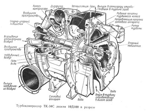 На дизеле 10Д100установлены два турбокомпрессора, которые при работе дизеля подают параллельными потоками воздух в воздуходувку. ТК состоит из 2-х агрегатов: одноступенчатой газовой турбины и центробежного компрессора. Для раскрутки ротора используется энергия отработавших газов дизеля.