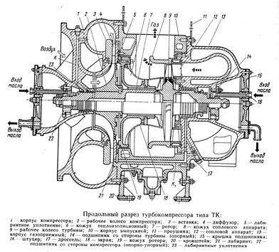 Отработавшие газы по выпускному коллектору поступают в газоприемный корпус и далее в сопловой аппарат, в котором газы приобретают необходимое направление и высокую скорость, направляются на лопатки турбинного колеса ротора. Ротор приходит во вращение. После этого газы через выпускной корпус удаляются в атмосферу. Скорость вращения ротора достигает 17000-19000 об/мин. Рабочее колесо компрессора засасывает воздух по входным каналам корпуса компрессора из атмосферы и сообщает ему кинетическую энергию. Воздух проходит лопаточный диффузор и попадает в расширяющийся канал корпуса (улитку), где кинетическая энергия воздуха превращается в потенциальную, т.е. за счет уменьшения скорости происходит повышение давления воздуха до 0,77 кгс/кв.см. Далее воздух по воздуховоду направляется в воздуходувку.