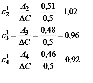 Осыдан Бұндағы Ғ – факторын алдын ала есептеп алады. Ол үшін концентрациялары әртүрлі (С1 -ден Сn -ге дейінгі) Сi ерітінділерді дайындайды. Содан соң әр ерітіндінің А -ын өлшейді. Аi – біріншімен салыстырып, сосын екіншісін 1-шімен, үшіншіні 2-шімен, төртіншіні 5-шімен, бесіншіні 6-шы ерітіндімен салыстырып барлық ерітінділердің оптикалық тығыздықтарын өлшейді. Алыңған мәліметтерден мына теңдік бойынша Ғ -ты есептейді: Бұндағы Со – бұл А-ны өлшегенде салыстырмалы ерітінді етіп алынған ерітіндінің концентрациясы. Ғ – бұл молярлы жұту коэффициентіне кері, l=1 см болғандағы шама екенін (14.8) теңдіктен көруге болады. Белгісіз концентрацияны анықтау үшін белгілі бір эталонды ерітіндіні таңдап алу керек. Ол үшін есептеулер жүргізеді. Мысалы, оптикалық тығыздықтың мынадай А =0,51; 0,48; 0,46; 0,41; 0,30 мәндері алынса және ерітінді концентрациялары С =0,5; 1,0; 1,5; 2,0; 2,5; 3,0 мг болса.