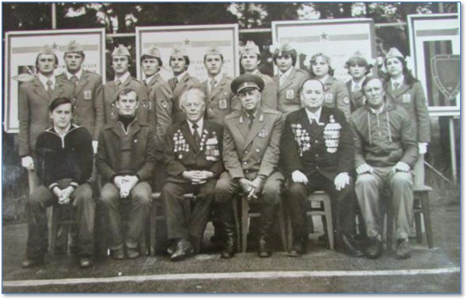 Юнармейцы Сасовского технологического техникума с командующим Всесоюзной военно-спортивной игры «Орлёнок», дважды Героем Советского Союза, летчиком-космонавтом СССР, генерал-лейтенантом авиации Г.Т. Береговым, 1980 год. Крайний справа во втором ряду – А.П.Романов