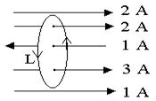 $$$ 464 Чему равна циркуляция вектора напряженности магнитного поля вдоль контура L, охватывающего 3 из 5 проводников с током? Величины и направления токов в проводниках указаны на рисунке: