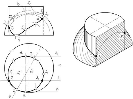 Задача 4. Побудувати проекції лінії перетину циліндра з півкулею (рис. 8.6). Насамперед знайдемо характерні точки: а) у точках 3 і 4 крайні ліва і права твірні циліндра перетинаються з поверхнею кулі. Щоб знайти ці точки, застосуємо фронтальну площину b, яка проходить через середину циліндра і перетинає кулю по колу, а циліндр по твірних; б) у точках 9 і 10 головний меридіан кулі перетинає твірні циліндра; в) найближча точка 5 і найвіддаленіша від спостерігача точка визначається за допомогою січних площин j і D. Проміжні точки лінії перетину знаходимо за допомогою допоміжних фронтальних площин. Так площина S перетинає поверхню кулі по колу, а поверхню циліндра – по твірних. На перетині цих ліній знаходимо точки 7 і 8 (рис. 8.6).