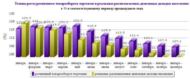 Тенденции, характерные для экономики страны в 2011 г., оказали существенное влияние на состояние потребительского рынка и привели к сжатию внутреннего потребительского спроса, что сказалось на замедлении темпов розничного товарооборота. Начиная с июня, темпы роста розничного товарооборота торговли снижались, составив по итогам 2011 г. до 107,1%. В IV квартале наблюдается тенденция снижения объемов товарооборота относительно уровня соответствующих месяцев прошлого года. Основным фактором стал существенный рост цен на потребительские товары при относительно невысоком повышении реальных денежных доходов населения. Как следствие – изменение структуры потребления товаров населением в сторону увеличения доли покупок более дешевых продуктов. В макроструктуре розничного товарооборота превалирует доля продовольственных товаров, которая составляет 51,4%. В целях сохранения стабильной ситуации продолжается работа прежде всего по максимальному наполнению потребительского рынка достаточным ассортиментом продовольственных и непродовольственных товаров, преимущественно отечественного производства, увеличению объемов выпуска социально значимых продовольственных товаров, а также по оптимизации поставок потребительских товаров на экспорт с целью недопущения разбалансированности внутреннего рынка.