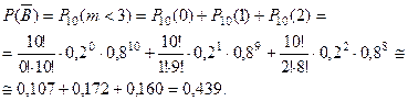 Полученная формула называется формулой Бернулли. Пример 1. В среднем пятая часть поступающих в продажу автомобилей некомплектна. Найти вероятность того, что среди 10 – ти прибывших автомобилей имеют некомплектность: а) три автомобиля; б) хотя бы три. Событие а) По формуле (1),