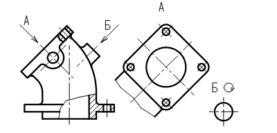 Вид отмечают прописной буквой русского алфавита, направление взгляда указывают стрелкой, обозначенной той же буквой, что и вид (рис. 45: местный вид В и рис. 46: дополнительный вид А; дополнительный вид Б).