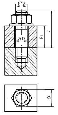 - сверлится отверстие диаметром 9 мм (внутренний диаметр резьбы М12) на глубину l = l1 + d; - выполняется фаска сх45°, где с следует взять из табл. 21; - нарезается резьба М12 на длину l2 = l1 + 0,5d. В такое отверстие можно ввернуть не только шпильку, но и болт или винт. На чертеже проставляются длина цилиндрического отверстия l, длина резьбы l 2, размер фаски и обозначение резьбы. Поверхность, на которую опирается головка болта, винта или шайба должна быть перпендикулярна оси крепежной детали и иметь достаточную чистоту. На литых деталях для распределения усилия сжатия на большую поверхность выполняются бобышки (приливы). Размеры опорных поверхностей под винты, болты и шайбы приведены в табл. 28 и 29.