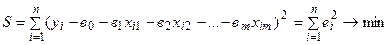 У випадку, коли Умову сталості дисперсії випадкової величини називають гомоскедастичністю і виконується вона тільки тоді, коли значення випадкової величини є результатом помилки вимірювання. Якщо випадкові величини не акумулюють сумарну дію факторів, які не увійшли до моделі, то дисперсія залишків буде змінюватися для окремих спостережень (таке явище називають гетероскедастичністю). Гетероскедастичність накладає суттєві обмеження на вибір методу оцінювання параметрів моделі. Наявність лінійної або високої кореляції між значеннями пояснювальних змінних (мультиколінеарність) призводить до серйозних проблем, пов’язаних із труднощами обчислювального характеру під час визначення параметрів рівняння регресії (через близькість до нуля визначника матриці системи нормальних рівнянь), спотворенням змісту коефіцієнтів регресії в процесі їх економічної інтерпретації, ненадійністю результатів моделювання (через чутливість їх до набору даних і вибраної специфікації моделі). Модель (4.4), для якої виконуються передумови 1-5, називається класичною лінійною моделлю множинної регресії. Якщо ж виконується і припущення 6, то модель має назву класичної нормальної лінійної моделі множинної регресії. Для оцінювання параметрів рівняння лінійної множинної регресії застосуємо критерій мінімізації суми квадратів відхилень фактичних значень пояснюваної змінної від теоретичних значень (метод найменших квадратів – 1МНК):