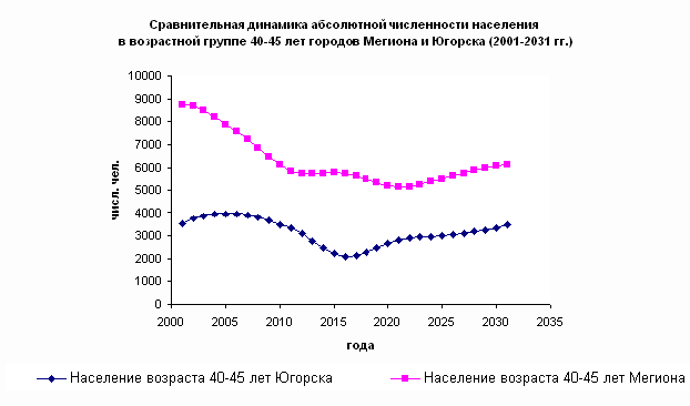 Ріст населення 40-45 років у найближчій і середньостроковій перспективі в Югорске створює сприятливу ситуацію для розгортання часткових житлових програм за участю населення, оскільки старша сорокалітня група населення накопичує засобу для рішення проблем молодої родини. На жаль, завершення першого десятиліття нового століття буде супроводжуватися в Югорске скороченням чисельності потенційних інвесторів житлових програм. Отже, такі необхідно модернізувати економічно і зробити їхній більш ефективними і доступними більшої частини населення. Віку 52-54 року за традицією вважаються періодом життя два роки до пенсії. Ріст даної категорії населення представляє загальнонаціональну проблему. У найкоротший час (до 2007-2008 р.) чисельність облич даної категорії в Югорске подвоюється, а до 2016 р. потроюється. Після цього починається повільне скорочення чисельності таких. Соціальні і социетальные наслідку цього процесу постаріння населення очевидні і вимагають вживання екстрених заходів на федеральному рівні, а не тільки на рівні муніципалітету і виконання програм дострокового пенсионирования договірних зобов'язань по переселенню літніх на Велику землю. Динаміка постаріння населення і наростання чисельності предпенсионных віків у Югорске все-таки уступає такий у порівнянні з Мегионом. У Югорске в найближчі 15 років чисельність предпенсионных вікових груп буде збільшуватися шпилясто в три рази і більш. Графік зміни чисельності предпенсионного віку в Югорске виявляє в 30-літній перспективі опуклий горб. Бурхливий ріст чисельності населення предпенсионного віку відбувається в перші п'ятнадцять років. Графік 7