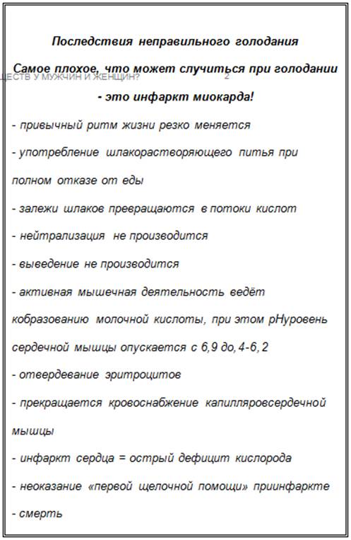 Каждый год некоторое количество мужчин становятся жертвами голодания. В процессе курса выведения шлаков или курса лечебного голодания шлаки растворяются, что реактивирует нейтрализованные прежде кислоты и токсины. Сердце перестаёт справляться с избыточными объёмами кислот. Начинаются судороги сердечной мышцы. В этом случае мы говорим про самое плохое, что может случиться при голодании - инфаркт. Многие пожилые и, разумеется, молодые люди, с целью укрепления или восстановления здоровья прибегают к древнему методу, который почитался во всех высокоразвитых культурах, когда-либо существовавших на Земле. Они постятся или даже голодают. На примере нашей знакомой из Штутгарта, которая курировала группу людей, проходящих курс лечебного голодания, мы убедились, что, не имея представления о химических процессах, происходящих в организме, при голодании можно допустить много ошибок. Зачастую голодающие пренебрегают методом «трёхступенчатого выведения шлаков». Выпивая чай и растворяя шлаки, в то же время они не дают организму возможности нейтрализовать кислоты, которые постепенно наводняют организм. В результате люди могут испытывать приступы агрессии, депрессии, пассивности, у них появляются нарывы, экземы, артрозы, всевозможные боли, отёки и другие неприятные проявления. Может даже произойти такое несчастье, вызванное голоданием, как инфаркт. Жертвами курсов голодания стали сотни, если не тысячи человек. Точнее, конечно, не самого голодания, а незнания реальных процессов протекающих при столь интенсивной и радикальной форме оздоровления, каким является голодание. К этой мысли мы пришли, потеряв одного знакомого. Это случилось около шести лет назад, когда мы активно занимались изучением химических процессов, происходящих в организме, разрабатывали действенные комплексы минеральных веществ и средства щелочного ухода за телом. В свои 50 лет он был успешным менеджером, добившимся всего, что только можно пожелать. У него была красавица жена, двое детей, великолепная вилла, две шикарных машины, головокружительная карьера управленца и т.д. и т.п. Однако, как это почти всегда случается, заработав к 50 годам много денег и подорвав здоровье, он решил потратить деньги на лечение. Он обратился в клинику, специализировавшуюся на лечебном голодании, которая должна была стать его первым шагом на пути к новой жизни. Туда он приехал на «Мерседесе», а уехал на катафалке. Что же случилось? Ему пришлось резко и коренным образам изменить привычный образ и ритм жизни. Никаких встреч, никаких обедов в ресторанах отелей, никакого стресса, никакого привычного распорядка дня. Ему пришлось отказаться от мяса, кофе, десертов, коньяка, сигарет и т.д. Целыми днями он должен был пить чай, растворяющий шлаки, и при этом ничего не есть. В результате потоки кислоты, образовавшиеся после растворения шлаков, буквально затопили организм, в котором практически не оставалось запасов минеральных веществ. Второй этап из трёх необходимых этапов выведения шлаков осуществлён не был. Организм не смог самостоятельно нейтрализовать кислоты, т.к. он не получал необходимых для этого энергетических минеральных веществ ни с вегетарианской пищей, ни с овощными соками. К тому же пациенту не рассказали о необходимости выпивать 1 - 2 литра воды в день для вымывания и разбавления ки