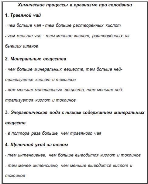 Мы говорим о закономерностях метода «трёхступенчатого выведения шлаков». Первый шаг представляет собой растворение шлаков с помощью травяного чая, при этом из старых шлаков вновь активизируются ранее нейтральные кислоты и необходимые энергетические минеральные вещества. Второй шаг - это нейтрализация восстановивших свои свойства кислот с помощью минеральных веществ и микроэлементов, поступающих из соответствующих пищевых добавок, а также из вегетарианской и богатой минеральными веществами пищи, которая всегда сопровождает процесс выведения шлаков. Выведение шлаков из организма осуществляем обильным питьём воды. При этом воды в день необходимо выпивать в 1,5-2 раза больше, чем травяного чая. Третий шаг - последовательное выведение кислот и шлаков, используя многочисленные возможности разумного щелочного ухода за телом. Сегодня многие кураторы групп лечебного голодания не устают повторять, насколько важно выводить кислоты и шлаки уже в самом начале курса. Во время каждого доклада и на собраниях члены группы держат ноги в щелочной ванночке. Именно так удаётся избежать первичных осложнений, лечебных кризисов и кризисов голодания. Их появление совершенно не обязательно, но, к сожалению, это происходит при незнании химических процессов, происходящих в организме во время выведения шлаков. В будущем, сумев избежать появления кризисов в процессе лечения, никто уже не будет его прерывать. Теперь цель любого курса голодания и курса выведения шлаков будет достигнута. Уплотнения в клетках, тканях и мембранах превратились в просветы. Все токсины удалены. На смену неподвижности и жесткости приходит упругость и эластичность. Жидкость может снова беспрепятственно циркулировать в клетках, сосудах и мембранах. Помимо освободившихся от шлаков жидкостей, в них циркулирует прежняя энергия. Благодаря огромным запасам минеральных веществ, мы расцветаем прямо на глазах, а в перспективе у нас долгая и счастливая жизнь здорового духа в красивом теле, обогащенном минеральными веществами. Так наз. голодные кризисы только тогда станут далёким прошлым, когда мы начнём последовательно и правильно применять три основных инструмента лечебного голодания - растворение шлаков травяным чаем; нейтрализацию кислот и токсинов минеральными веществами; выведение щелочными процедурами и вымывание водой кислот, токсинов и шлаков.