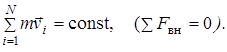 где m 1 и m 2 – массы взаимодействующих тел; r – расстояние между телами (тела – материальные точки или сферы). Силу можно выразить и через напряженность G гравитационного поля F = mG; г) сила тяжести F = mg, где g – ускорение свободного падения; д) сила трения скольжения F тр = m N, где m - коэффициент трения; N – сила нормальной реакции опоры. 22. Закон сохранения импульса