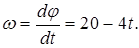 В момент времени t = 4 с угловая скорость w = (20 - 4×4)с-1 = 4 рад/с. Угловое ускорение вращающегося тела равно первой производной от угловой скорости по времени