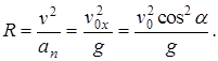 По вертикали: v y = v 0y - gt = v 0sin a - gt. (3) h = v 0 t sinα - gt 2/2. (4) Это движение равнозамедленное. 1. Радиус кривизны траектории находим из формулы нормального ускорения