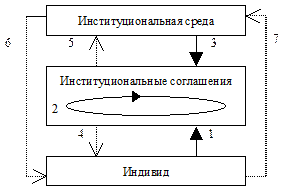 Рис..2. Трехуровневая схема исследования На первом уровне – индивиды, или экономические агенты, на втором – различные институциональные соглашения в виде рынков, фирм, гибридных (смешанных) форм, на третьем – институциональная среда, включающая системообразующие правила игры. По О. Уильямсону, институциональная среда – это правила игры, определяющие контекст, в котором осуществляется экономическая деятельность. Базовые политические, социальные и юридические правила образуют основу производства, обмена и распределения. Институциональная среда определяет характер отношений и связей между экономическими субъектами, которые формируют институциональное устройство (соглашения). Институциональное устройство – это контрактное отношение или структура управления, объединяющая хозяйственные единицы и определяющая способ их кооперации и/или конкуренции. Институциональное устройство влияет на функционирование и типы экономических организаций. Кратко рассмотрим каждую из семи зависимостей, хотя, по О. Уильямсону, ключевыми являются первые три типа. 1. Поведенческие предпосылки, от которых зависят модели рынков, фирм и государства. Зависимость 1 характеризуется как поведение, противоречащее или соответствующее правилам игры, а также направленное на изменение (создание) правил, которые не являются системообразующими. 2. Влияние институциональных соглашений друг на друга, выражающееся в изменении отношений на рынке, или структуры рынка в результате действия фирм, или поведения фирм под влиянием рыночной ситуации. Рынок и фирма – полярные формы институциональных соглашений с точки зрения способа решения проблемы координации. Кроме того, существуют гибридные формы институциональных соглашений, такие как субподряд или франчайзинг (коммерческая концессия). 3. Изменение системообразующих правил игры, означающее изменения в ценообразовании, налогообложении, антимонопольном и таможенном регулировании, правилах лицензирования, регистрации предприятий и т.п. Все это влияет на сравнительную эффективность альтернативных институциональных соглашений, а значит, и экономических организаций. Это – опосредованное влияние, поскольку прежде всего изменяются затраты ресурсов на использование существующих институтов и создание новых, т.е. трансакционные издержки. Однако в данном случае изменения в институциональной среде рассматриваются как экзогенные. 4. Формирование институциональными соглашениями социальных условий жизни индивида, а более узко – правил игры, показывающее, что предпочтения индивидов могут рассматриваться как эндогенные. Другими словами, свойства предпочтений оказываются зависимыми от особенностей институциональных соглашений. Поскольку правила кооперации и конкуренции ограничивают набор возможностей для экономического агента, то тем самым ограничивается и размерность ситуации выбора. Соответственно изменение размерности и структуры ситуации выбора приводит к изменению предпочтений. 5. Влияние институциональных соглашений на институциональную среду, означающее опосредованное влияние индивида (если здесь проводится принцип методологического индивидуализма) на формирование системообразующих правил игры. Такое воздействие осуществляется через организацию, а в основе анализа данной зависимо