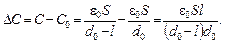 Результат внесения незаряженной металлической пластины в пространство между обкладками не зависит от ее конкретного расположения, т. к. она не создает своего электрического поля. Поэтому предположим, что пластина вплотную прижата к одной из обкладок. Это эквивалентно уменьшению расстояния между обкладками до d = d 0 – l, что вызовет увеличение емкости конденсатора до величины: