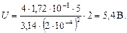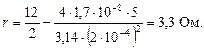 Пример 18. Источник тока с ЭДС 12 В замкнут медным проводом длиной 5 м и диаметром поперечного сечения 0,2 мм. Сила тока в цепи равна 2 А. Найти внутреннее сопротивление источника и падение напряжения во внешней части цепи.