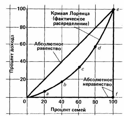 Неравенство доходов и богатства может достигать огромных масштабов и создавать угрозу для политической и экономической стабильности в стране. Поэтому практически все развитые страны мира постоянно осуществляют меры по сокращению такого неравенства. Но разработка этих мер возможна лишь при умении точно измерять степень дифференциации доходов и богатства, а также результаты воздействия на нее с помощью государственной политики. Для определения степени неравенства доходов в мировой практике используется кривая Лоренца. Также кривую Лоренца можно использовать, чтобы сравнивать распределение доходов в различные периоды времени, в различных странах, между различными социальными группами. Кривая Лоренца — это графическое изображение функции распределения. Она была предложена американским экономистом Максом Отто Лоренцем в 1905 году как показатель неравенства в доходах населения. В таком представлении она есть изображение функции распределения, в котором аккумулируются доли численности и доходов населения. В прямоугольной системе координат кривая Лоренца является выпуклой вниз и проходит под диагональю единичного квадрата, расположенного в I координатной четверти. Форма кривой Лоренца характеризует степень неравномерности распределения доходов. Чем круче изгиб кривой и чем дальше она отстоит от кривой абсолютного равенства, тем больше неравенство в распределении доходов, и наоборот. Характеризуя величину денежных доходов у различных групп населения, кривая Лоренца позволяет прогнозировать изменение благосостояния людей, их покупательную способность и, следовательно, спрос, это дает возможность принимать необходимые меры по регулированию и поддержанию равновесного ЧНП. Для ее построения нужны данные о том, какая часть семей получила ту или иную долю общего дохода страны.