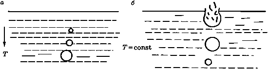 Рис. 1 Механизм кипения: в жидкости всегда имеется растворенный газ, степень растворения которого понижается с ростом температуры. Кроме того, на стенках сосуда имеется адсорбированный газ. При нагревании жидкости снизу (рис. 2) газ начинает выделяться в виде пузырьков у стенок сосуда. В эти пузырьки происходит испарение жидкости. Поэтому в них, кроме воздуха, находится насыщенный пар, давление которого с ростом температуры быстро увеличивается, и пузырьки растут в объеме, а следовательно, увеличиваются действующие на них силы Архимеда. Когда выталкивающая сила станет больше силы тяжести пузырька, он начинает всплывать