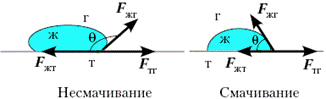 Если опустить стеклянную палочку в ртуть и затем вынуть ее, то ртути на ней не окажется. Если же эту палочку опустить в воду, то после вытаскивания на ее конце останется капля воды. Этот опыт показывает, что молекулы ртути притягиваются друг к другу сильнее, чем к молекулам стекла, а молекулы воды притягиваются друг к другу слабее, чем к молекулам стекла. Если молекулы жидкости притягиваются друг к другу слабее, чем к молекулам твердого вещества, то жидкость называют смачивающей это вещество. Например, вода смачивает чистое стекло и не смачивает парафин. Если молекулы жидкости притягиваются друг к другу сильнее, чем к молекулам твердого вещества, то жидкость называют не смачивающей это вещество. Ртуть не смачивает стекло, однако она смачивает чистые медь и цинк. Расположим горизонтально плоскую пластинку из какого-либо твердого вещества и капнем на нее исследуемую жидкость. Тогда капля расположится либо так, как показано на рис.1(а), либо так, как показано на рис. 1(б).