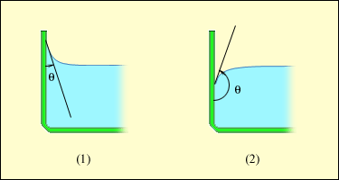 Рис.1 (а) Рис.1(б) В первом случае жидкость смачивает твердое вещество, а во втором — нет. Отмеченный на рис.1 угол θ называют краевым углом. Краевой угол образуется плоской поверхностью твердого тела и плоскостью, касательной к свободной поверхности жидкости, где граничат твердое тело, жидкость и газ; внутри краевого угла всегда находится жидкость. Для смачивающих жидкостей краевой угол острый, а для не смачивающих — тупой. Чтобы действие силы тяжести не искажало краевой угол, каплю надо брать как можно меньше. Поскольку краевой угол θ сохраняется при вертикальном положении твердой поверхности, то смачивающая жидкость у краев сосуда, в который она налита, приподнимается, а несмачивающая жидкость опускается