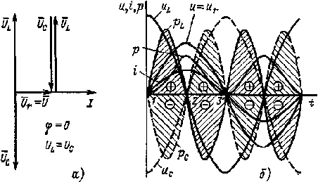 Резонанс может быть получен или путем подбора параметров цепи при заданной частоте сети, или путем подбора частоты сети при заданных параметрах цепи. На рис. 2.14, б изображены графики мгновенных значений тока i, напряжения и сети и напряжений иL , иC , иr на отдельных участках, а также активной р = iur и реактивной pL= iиL , Активная мощность р все время положительна, она поступает из сети к активному сопротивлению и выделяется в нем в виде тепла. Мощности pL и рС знакопеременные, и, как видно из графика, их средние значения равны нулю. В момент времени t = 0 (точка I на рис. 2.14, б) ток в цепи i = 0 и энергия магнитного поля