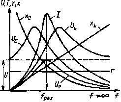 Аналогичные процессы происходят и в последующие четверти периода. Таким образом, при резонансе реактивная энергия циркулирует внутри контура от индуктивности к емкости и обратно. Обмена реактивной энергией между источниками и цепью не происходит. Ток в проводниках, соединяющих источник с цепью, обусловлен только активной мощностью. Для анализа цепей иногда используют частотный метод, позволяющий выяснить зависимость параметров цепи и других величин oт частоты. На рис 2.15 изображены графики зависимости Ur, UC, UL, I, хC, хL, от частоты при неизменном напряжении сети. При f = 0 сопротивления xL = 2π fL = 0, В интервале частот от f = 0 до f = f pез нагрузка имеет активно-емкостный характер, ток опережает по фазе напряжение сети. В интервале частот f = f pез до f → ∞ нагрузка носит активно-индуктивный характер, ток отстает по фазе от напряжения сети. Наибольшее значение напряжения на емкости получается при частоте, несколько меньшей резонансной, на индуктивности - при частоте, несколько большей резонансной. Явления резонанса широко используются в радиоэлектронных устройствах и в заводских промышленных установках. Пример 2.4. Определить частоту сети, при которой в цепи рис. 2.11, а возникает резонанс напряжений. Определить также, во сколько раз напряжение на индуктивности больше напряжения сети при резонансе, если цепь имеет следующие параметры: r = 20 Ом, L = 0,1 Гн, С = 5 мкф. Решение. Резонансная частота