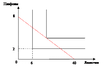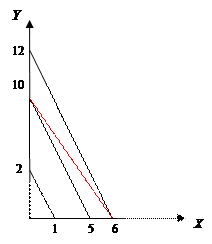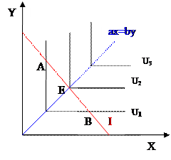 На рисунке бюджетное ограничение I имеет три общие точки с кривыми безразличия: А, В и Е. Из них точка Е является предпочтительной, так как принадлежит наиболее удаленной от начала координат кривой безразличия U2. Следует отметить, что если будет меняться бюджет потребителя, то в данном случае оптимальные наборы будут лежать на линии, проходящей через точки перегиба кривых безразличия. Эту линию можно описать уравнением aх=by, где числовые коэффициенты b и а показывают, в каких пропорциях блага х и y дополняют друг друга, т.е. х: у = b: а. Заметим, что точка Е, соответствующая оптимальному набору благ, лежит на пересечении этой линии и бюджетного ограничения.