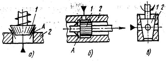 Рис. 28 Для конструкції будь-кого гідроапарату характерна наявність замочно-регулюючого елементу (рис. 28), яким є рухома деталь 1 (клапан, золотник, кран), при переміщенні частково і повністю перекриваюча робочий прохідний перетин гідроапарата, Робочий прохідний перетин А створюється в клапанах (рис. 28, а) між кромками сідла 2 і клапана 1 (площа робочого перетину змінюється при осьовому зсуві клапана 1), в золотниковому гідроапараті (рис. 28, б) між гострими кромками циліндрового розточування корпусу 2 і циліндрового пошуку золотника 1 (площа робочого перетину змінюється при осьовому зсуві золотника), в гідроапараті (рис. 28, в) крана - між гострими кромками каналів корпусу 2 і крана 1 (площа робочого перетину змінюється при повороті крана). Клапаном називають гідроапарат, в якому величина відкриття робочого прохідного перетину (робочого вікна) змінюється під впливом потоку робочої рідини, що проходить через гідроапарат. Виходячи з визначення, клапан є автоматичним гідроапаратом, не вимагаючим під час роботи якої-небудь зовнішньої дії на його замочно-регулюючий елемент. У гідроапаратах неклапанної дії (розподільниках і дроселях) замочно-регулюючі елементи не переміщаються під дією потоку робочої рідини, що проходить через гідроапарат. Щоб змінити робочий прохідний перетин в розподільнику або дроселі, необхідно впливати на їх запорно-регулюючі елементи ззовні, наприклад, перемістити золотник розподільника за допомогою електромагніту, повернути кран вручну і т.д. У регульованих гідроапаратах відкриття робочого прохідного перетину або силова дія на замочно-регулюючий елемент можуть бути змінені ззовні, наприклад, шляхом регулювання сили пружини в клапанах. Серед регульованих гідроапаратів виділяють гідроапарати, що настроюються, в яких регулювання можливе тільки в неробочому стані, наприклад, шляхом заміни в клапані регулюючої шайби. Регулюючим гідроапаратом називають гідроапарат, призначений для зміни тиску або витрати робочої рідини шляхом часткового відкриття робочого прохідного перетину (робочого вікна). В таких гідроапаратах замочно-регулюючі елементи при роботі можуть займати незліченну безліч проміжних положень. До регулюючих гідроапаратів відносяться, наприклад, напірні клапани, дроселі, розподільники і т.д. Спрямовуючим гідроапаратом називають гідроапарат, призначений тільки для зміни напряму потоку робочої рідини. Тиск і витрата робочої рідини, що проходить через спрямовуючий гідроапарат, не змінюються. До спрямовуючих гідроапаратів відносяться, наприклад, зворотні клапани, гідрозамки, спрямовуючі розподільники і т.д. Для цих гідроапаратів характерне виконання своїх функцій шляхом повного відкриття або закриття робочих прохідних перетинів, тобто спрямовуючі гідроапарати працюють за принципом «відкрито-закрито». Гідроапарати за способом монтажу можуть мати різні виконання. Гідроапарати в звичному виконанні мають свої корпуси, вбудовані гідроапарати своїх корпусних деталей не мають - вони є складовими частинами інших гідравлічних пристроїв. Декілька вбудованих гідроапаратів можуть бути розміщені в одному корпусі у вигляді гідравлічного блоку або модулю.