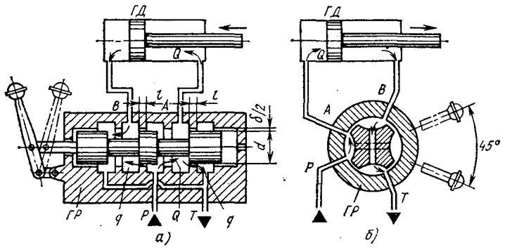 Рис. 33 Запорно-регулюючий елемент виконується у вигляді золотника з осьовим рухом або крана з поворотним рухом (рис. 33). В положенні золотника розподільника ГР, показаному на малюнку, основний потік масла Q з напірної лінії Р по лінії А поступає в штокову порожнину гідродвигуна ГД, а з поршневої порожнини витісняється через лінію В і розподільник в зливну лінію Т. Після перемикання розподільника управо (або повороту ручки на 45°) напрям потоку реверсує (Р-ГР-В-ГД-А-ГР-Т), внаслідок чого змінюється напрям руху робочого органу. Трьохпозиційні розподільники мають додатково середню позицію, в якій можлива зупинка ГД. Направляючі апарати повинні мати малі витоки, незначні втрати тиску при протіканні через них потоку масла, мінімальні зусилля для переміщення золотника (або крана), а також можливість отримання ненаголошеного реверсу руху робочого органу при обмеженому часі перемикання. Переміщення золотника в корпусі можливе лише за наявності діаметрального зазора δ між цими деталями, по якому можливі витоки масла між порожнинами. Осьове зусилля, необхідне для переміщення золотника, залежить від робочого тиску, розмірів золотника, а також правильності геометричної форми золотника і отвору в корпусі. Тертя в золотниковій парі залежить від часу перебування золотника у спокої під тиском. Тертя золотника за наявності робочого тиску виникає унаслідок нерівномірного розподілу тиску в зазорі, що створює неврівноважене радіальне зусилля. Останнє діє лише на ті ущільнюючі поясочки, по яких йде витік масла, викликаний перепадом тиску. Поясочки, що мають однаковий тиск з обох боків, радіальним зусиллям не навантажуються. При перемиканні розподільників можливі гідравлічні удари в системі. Для усунення ударів на робочих кромках золотника виконуються конічні фаски або дроселюють прорізи, що забезпечують достатньо плавну зміну тиску в порожнинах гідродвигуна. Крім того, в розподільниках з гідравлічним і електрогідравлічним управлінням передбачається можливість регулювання швидкості переміщення золотника (час реверсу 0,05-3 с). Коли необхідна висока швидкодія, можуть застосовуватися розподільники з електроуправлінням, що спрацьовують за 0,01-0,02 с. Розподільники мають п'ятикамерну або трикамерну конструкцію корпусу. В останньому випадку зливна лінія проходить через порожнини торців золотника. Зворотні клапани практично вільно пропускають потік масла в одному напрямі; при русі масла в протилежному напрямі клапани замикають потік. Зворотні клапани повинні бути герметичними в закритому положенні і володіти мінімальним гідравлічним опором у відкритому положенні. Гідроклапани тиску пропускають через себе потік масла, коли досягаються задані тиск в лінії підводу, різниця тиску в лінії управління і лінії відведення або різниця тиску в двох лініях управління. Види виконань гідророзподілювачів класифікують по конструкції, типу управління, діаметру умовного проходу, числу позицій, числу основних гідроліній, гідросхемі, способу установки золотника в позицію і типу проміжної плити. Розподільники мають два основних конструктивних виконання: типів В і Р з міжнародними приєднувальними розмірами. По типу управління розрізняють розподільники з управлінням: ручним від рукоятки або поворотної кнопки, ножним, механічним від кулачка, гідравліч