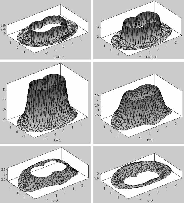 Для установки необходимой формы представления результатов расчёта, отличной от той, которая задана по умолчанию, следует воспользоваться пунктом меню Plot. Если есть необходимость увидеть процесс видоизменения решения задачи во времени, то в окне Plot Solution надо активизировать строки Height(3-D plot), Animation и Show mesh. В этом случае в графическом окне можно получить мультипликацию трёхмерного изображения решения u (x, y, t), некоторые кадры которой для разных моментов времени показаны на рис.7.